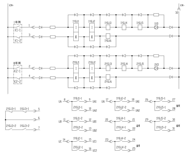 当Ⅱ母隔离刀闸辅助开接点K2-1闭合时,2YQJ1~2YQJ6动作,其中2YQJ1、2YQJ2的接点自保持,2XD亮,指示交流电压由Ⅱ母PT接入;当Ⅱ母隔离刀闸辅助开接点K2-1断开,辅助闭接点K2-2闭合时,将2YQJ1、2YQJ2进行复位。2YQJ3~2YQJ6的接点为不带自保持的瞬动接点。