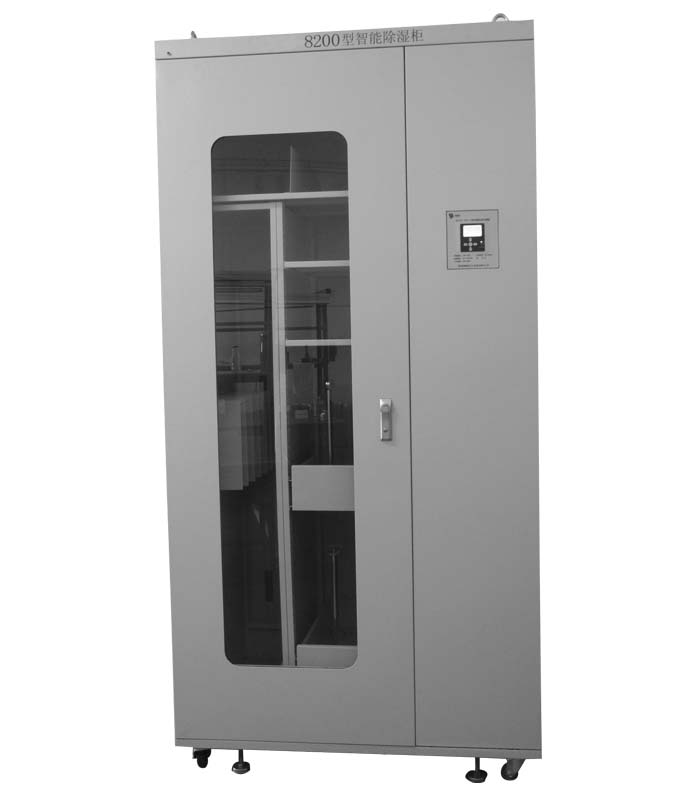 柜外传感器检测箱外温湿度信息作为参考,柜内传感器检测箱内温湿度信息,并传递到控制器由控制器分析处理:当箱内的湿度达到或超过预先设定的值时,控制器输出信号使驱动器中的继电器触点闭合,加热器接通电源开始工作,高温使记忆合金弹簧动作,拉动风门挡板的开合来执行的,使分子筛对柜体外部释放水分后,再恢复到对柜体内部除湿状态,这样周期反复,就可以将柜体内部的湿度降到设定值;然后驱动盒中的继电器触点断开,加热停止,内置小风扇驱动,加快PTC降温速度。