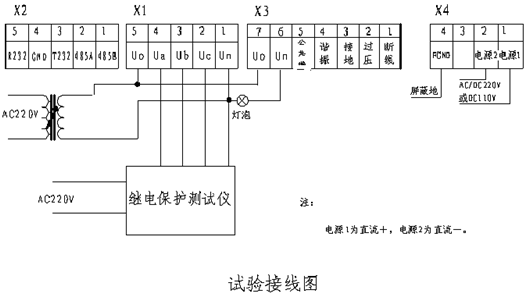 给装置信号输入端“Uo、Un”输入工频30V — 120V之间电压(时间大于3秒钟),A、B、C三相任两相输入100V电压,正序相位差60度,另一相输入零,此时伴随灯泡闪烁一次,“接地”指示灯亮、报警,显示故障信息。当“Uo、Un” 端输入信号小于30V时,本装置不动作。